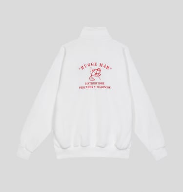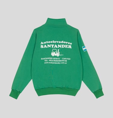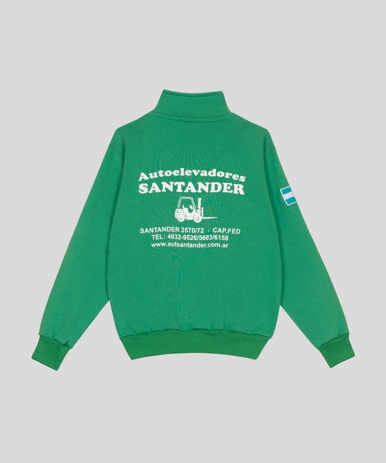 Buzo de frisa invisible de algodón peinado con medio cierre, espalda estampada y bandera Argentina bordada en la manga.
