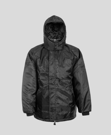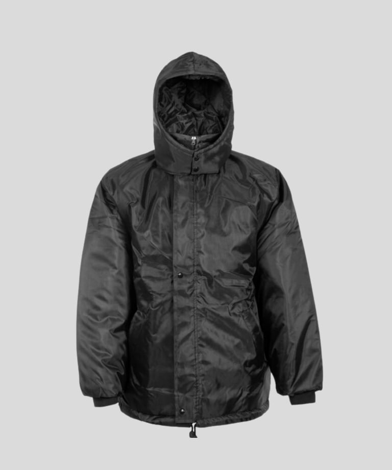 Campera de tela trucker rellena de guata con bolsillos al frente, bolsillo interno y capucha desmontable.
